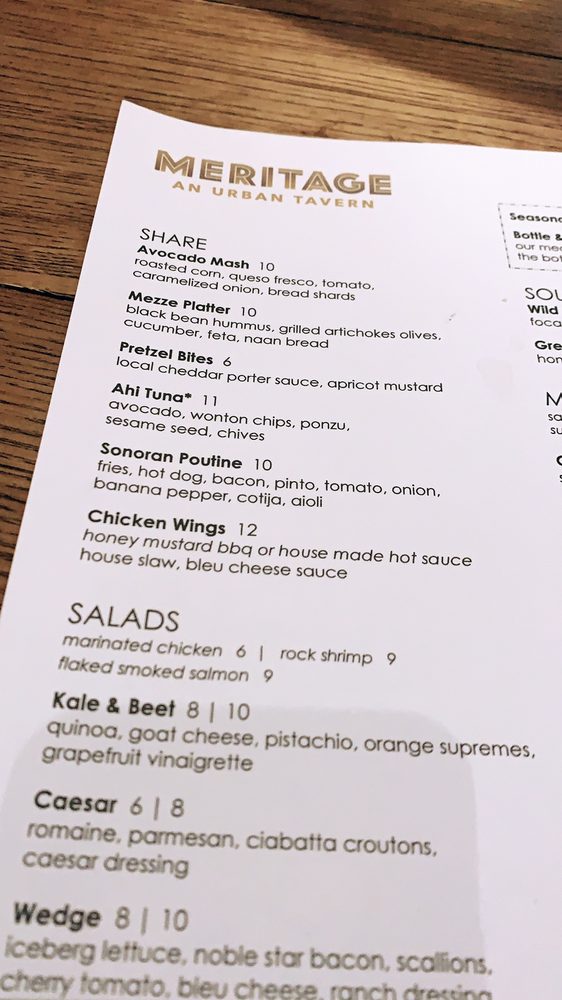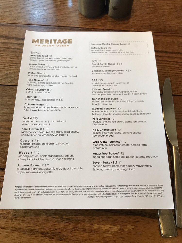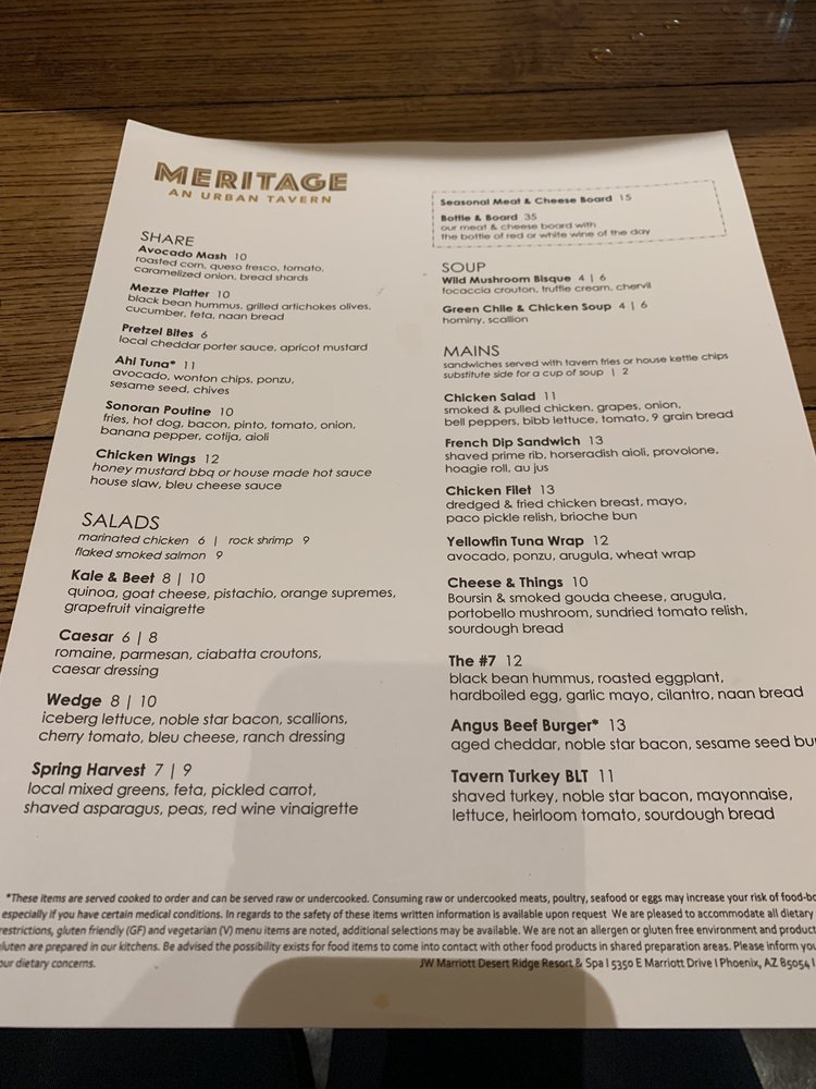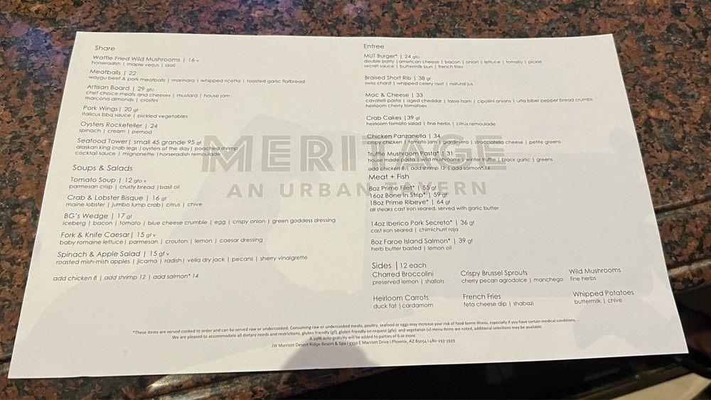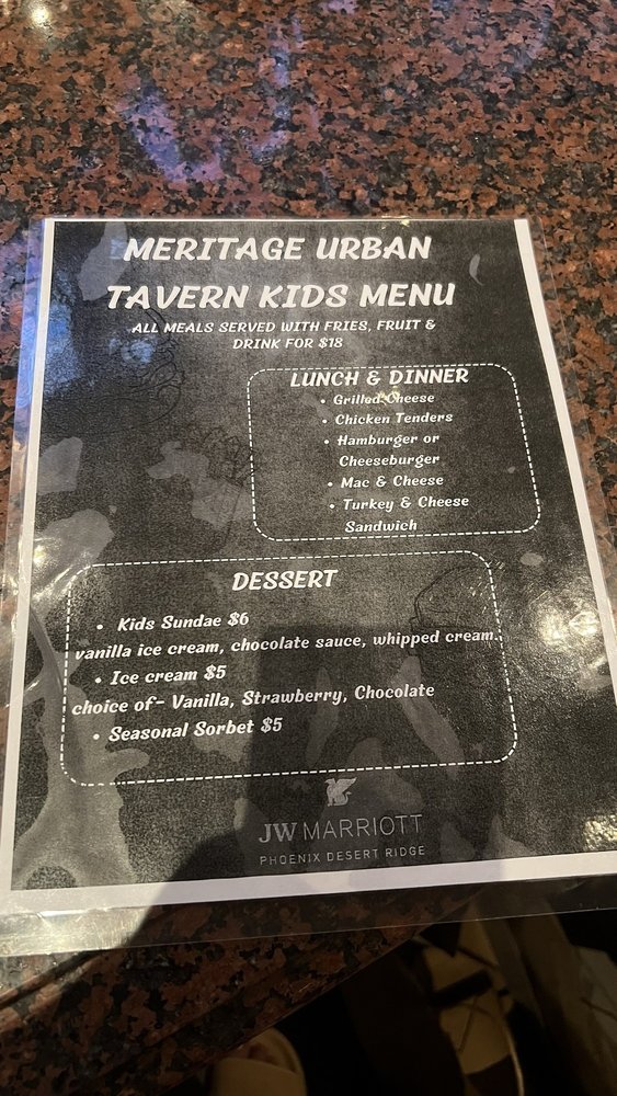 Welcome to MERITAGE - an urban tavern, a delightful escape nestled within the Marriott Desert Ridge Resort in Phoenix, AZ. This modern establishment excels in blending a casual atmosphere with upscale dining, making it an ideal spot for families, couples, and groups alike.